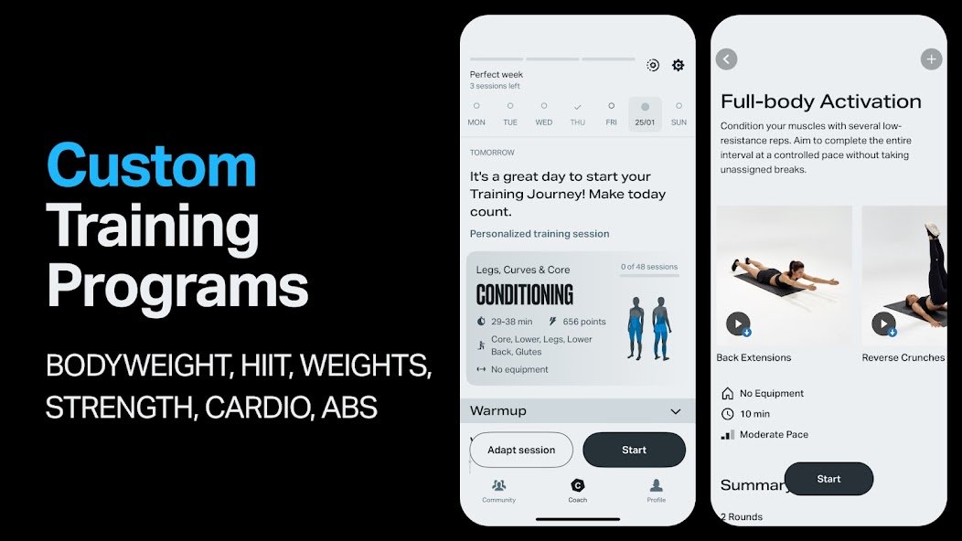 | Jenis Latihan | Bodyweight, HIIT, beberapa latihan dengan barbel, running, custom training. | Bodyweight dan latihan gym, disesuaikan dengan data pribadi. | Bodyweight, angkat beban, kardio, fokus pada latihan kekuatan. |